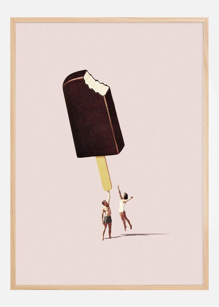 Sellel võluval plakatil on kujutatud ainulaadne ja mänguline pilt kahest inimesest, kes näivad olevat leidnud hiiglasliku jäätisepulga! Oma fantaasiarikka koosluse ja sooja pastellroosa taustaga pakub see pilt suverõõmu ja nostalgiat. Rõõmsad tegelased, kes on riietatud lihtsatesse ujumisriietesse, sirutavad käed jäätisepulga poole, mis näeb realistlik välja tänu hammustatud osale, luues vahva kontrasti minimalistliku ümbrusega. See loominguline ja elav stseen püüab vaataja tähelepanu ja toob meelde päikeselised päevad.