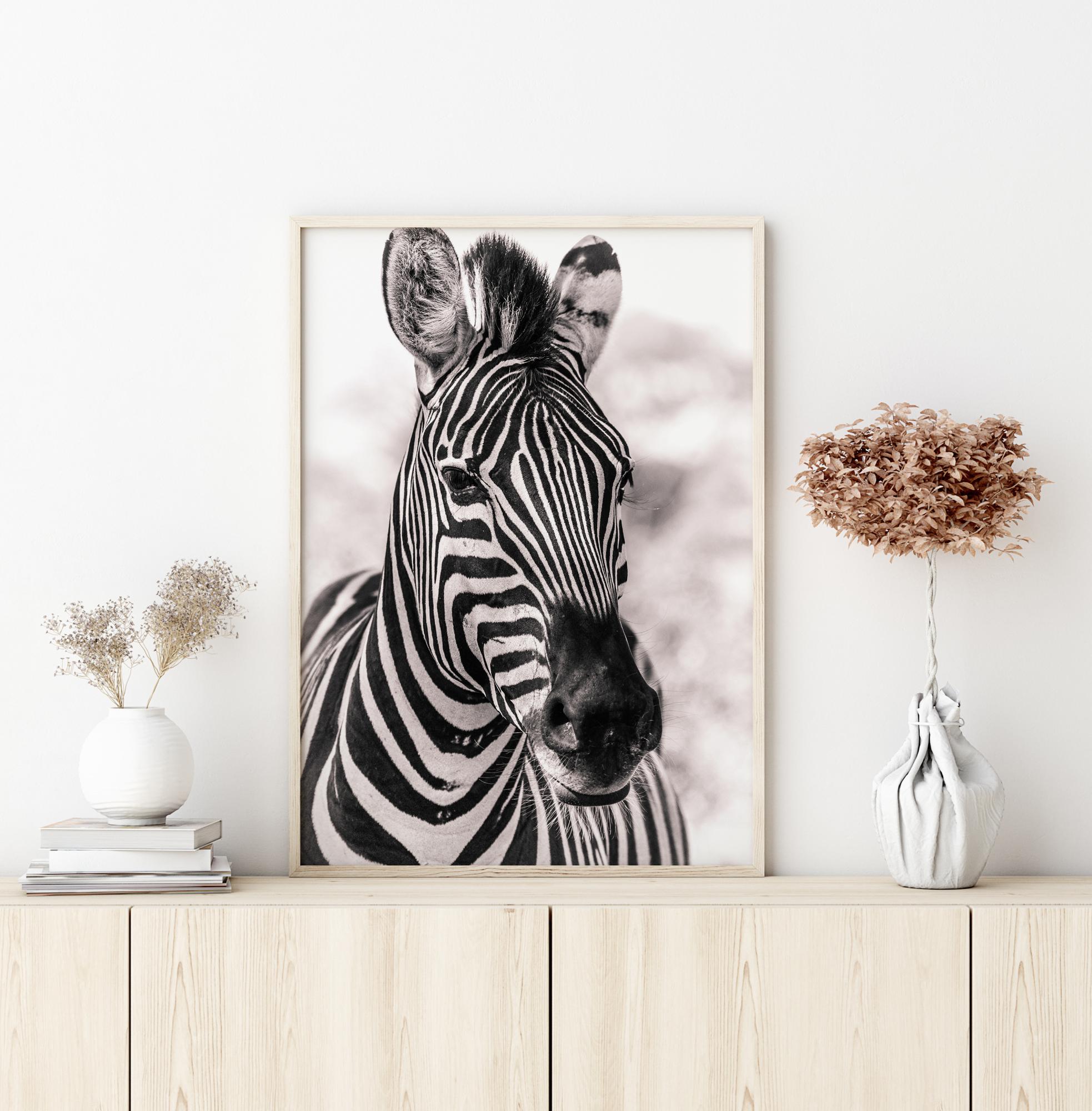 Loomaposter, millel on kaamera poole vaatav sebra. Sebra näib lõdvestunud, seistes paigal ühe kõrva ettepoole ja teise tahapoole suunatuna. Naudi selle armsa looma mustvalgeid mustreid ja kombineeri see oma lemmikvärviga seinal, et triipudele veidi värvi lisada.