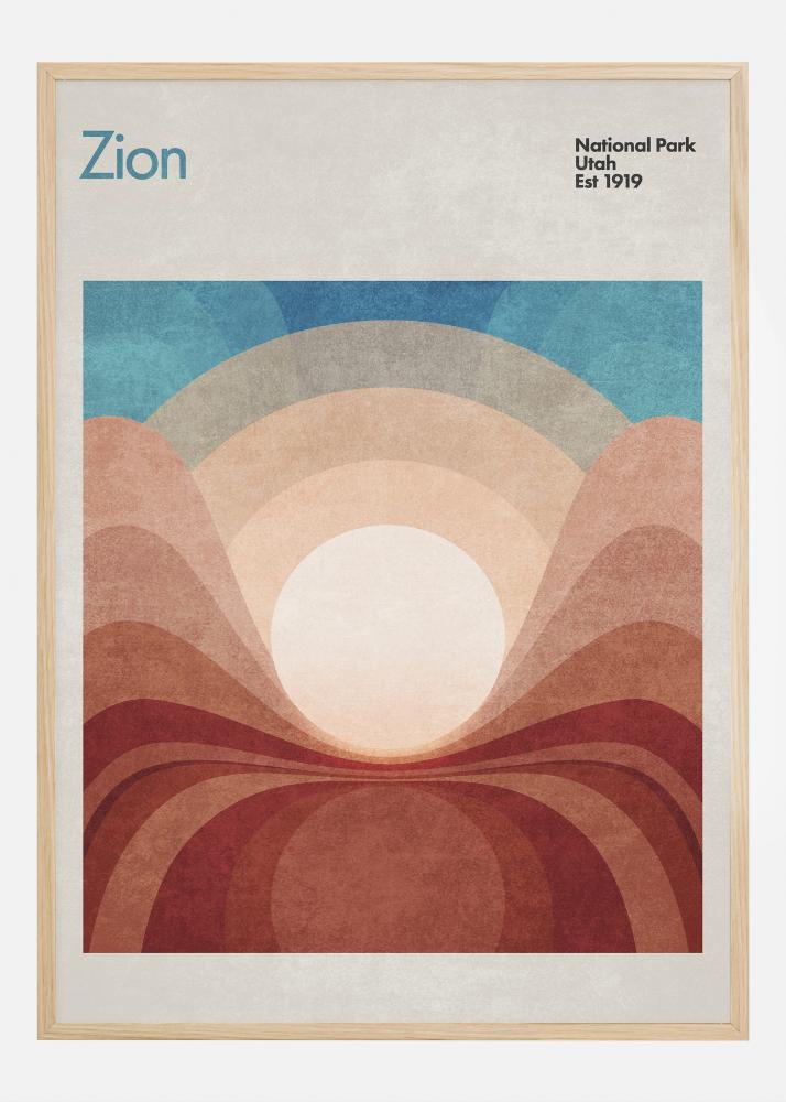 See plakat haarab Zion National Parki võimsat loodust stiiliseeritud maastikukihtidega, mis loovad pargi ikooniliste kivimoodustiste ja avarate vaadete abstraktse tõlgenduse. Tekst "Zion National Park Utah Est 1919" annab ajaloolise konteksti ja austab pargi pärandit kui rahvuslikku aarde juba varasest 20. sajandist.