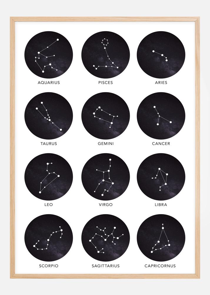 Kingi kellelegi, keda sa armastad, tähtkuju plakat või hellita ennast millegi ilusaga. See stiilne plakat sisaldab kõiki tähtkujude motiive ja motiivide all on nende nimed inglise keeles. Ära unusta valida oma postrile sobivat raami!